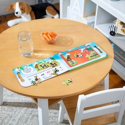 - 2-pack of 2 15-piece magnetic jigsaw puzzles (farm-themed and vehicles-themed) in compact, fold-out formats