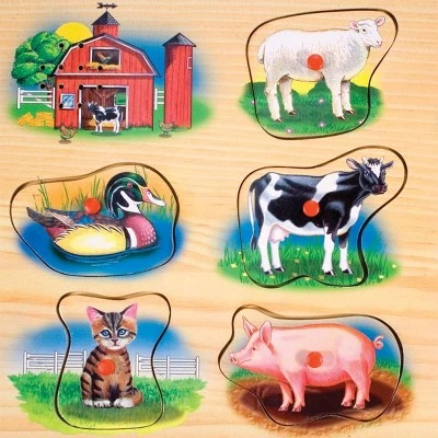 Each happy farm animal “sounds off” in its own voice when the animal puzzle piece is placed correctly in the puzzle board of this wooden eight-piece peg puzzle! Eight sounds in all. Full-color, matching picture under each piece.