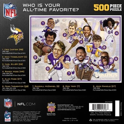 This MasterPieces 500pc NFL puzzle measures 15” x 21” and features some of the greatest NFL players to ever wear a Minnesota Vikings uniform. The easily recognizable and fun caricatures are shown in an setting specific to the team name, city or history. To reduce its impact on our environment, the chipboard used in this puzzle is made of recycled material.