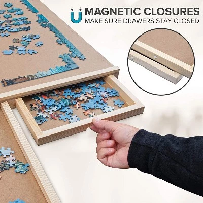 - Tucks away neatly when not in use without disrupting your puzzle progress; outer dimension 27″ x 35″ x 1.5″; Large drawer 13.5″ x 12.1″; inner dimension 26″x 34″; Small drawer 12.9″ x 5.9″.