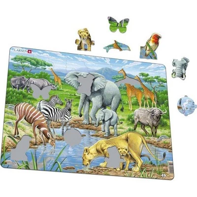Help your child learn to to identify different animal species of the African Savanna. All of the animals are gathered around a watering hole, quenching their thirst in the dry heat of the summer. Species included are Rhinos, giraffes, elephant with kid, zebras, buffalo, antelope and lion with cubs.
