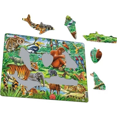 Learn how to identify different Asiatic jungle species. Species from top left: Slender Loris, Great Indian Hornbill, Krait, Red-naped Trogon, Lar gibbon, Indian Rhinoceros, White-breasted Kingfisher, Orangutan, Blue-throated Bee-eaters, Tiger, Indian Elephant, Sun Bear, Indian Flying Fox, Atlas Moth, Sambar, Spotted Linsang, Torch Ginger.