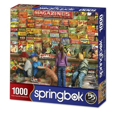 Transport back to another era of innocence where kids strolled the town square pining for the newest comic book. This 1000 piece puzzle features a beautiful close-up illustration of a street-side comic book shop, complete with colorful illustrations and comic book covers.