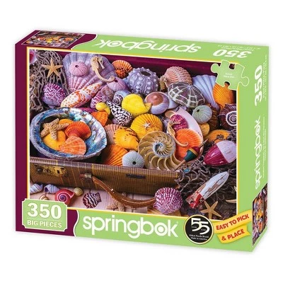 Unearth the hidden riches of Vacation Treasures! This beautiful seashell puzzle is a reissue of our popular 1500 piece puzzle, now available in the easy to pick & place 350 large piece format.