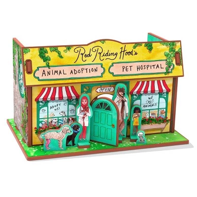 This heartwarming tale of Red Riding Hood deviates from the original, to create a wholesome story of inclusivity and kindness to all living things. After the scary Wolf is injured when he’s chased from the house by Grandma’s broom, Red Riding Hood decides to take care of the hurt animal. After realizing he’s just a hungry animal that also needs to eat, she is inspired to open a Pet Hospital and Adoption Agency, so no animal is left alone, hurt, or sick. Includes: Animal Hospital and Adoption Agency, Red Riding Hood, Grandma, Wolf, Veterinary Table, Animal Play Structure, 4 Customers, 8 Dogs, Guinea Pig, Chicken, Rabbit, 3 Cats, Pig, Storybook, and Carrying Case.