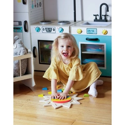 - This puzzle includes a sun-shaped wooden base with 16 brightly colored pieces.